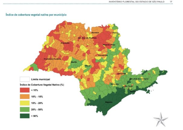 Segundo a entidade, o inventário ambiental produzido pelo Instituto Florestal, em 2020, apontou que 69,1% dos municípios paulistas têm menos de 20% de cobertura nativa. As piores regiões em conservação incluem municípios importantes, como Ribeirão Preto, São José do Rio Preto, Araçatuba e Presidente Prudente.