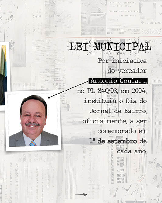 Sendo assim, nesta data, comemora-se o Dia do Jornal de Bairro, por meio da Lei nº 13.919 de 6 de novembro de 2004, que alterou a redação da lei nº 10.777, de 22/11/89, que já instituiu o dia do jornal de bairro. Isso graças ao projeto de lei 840/03, do Vereador Antonio Goulart/PMDB. A lei de 89 foi alterada por conta de um gravíssimo detalhe: na ocasião, o texto não apontava a data da comemoração: 1º de setembro.