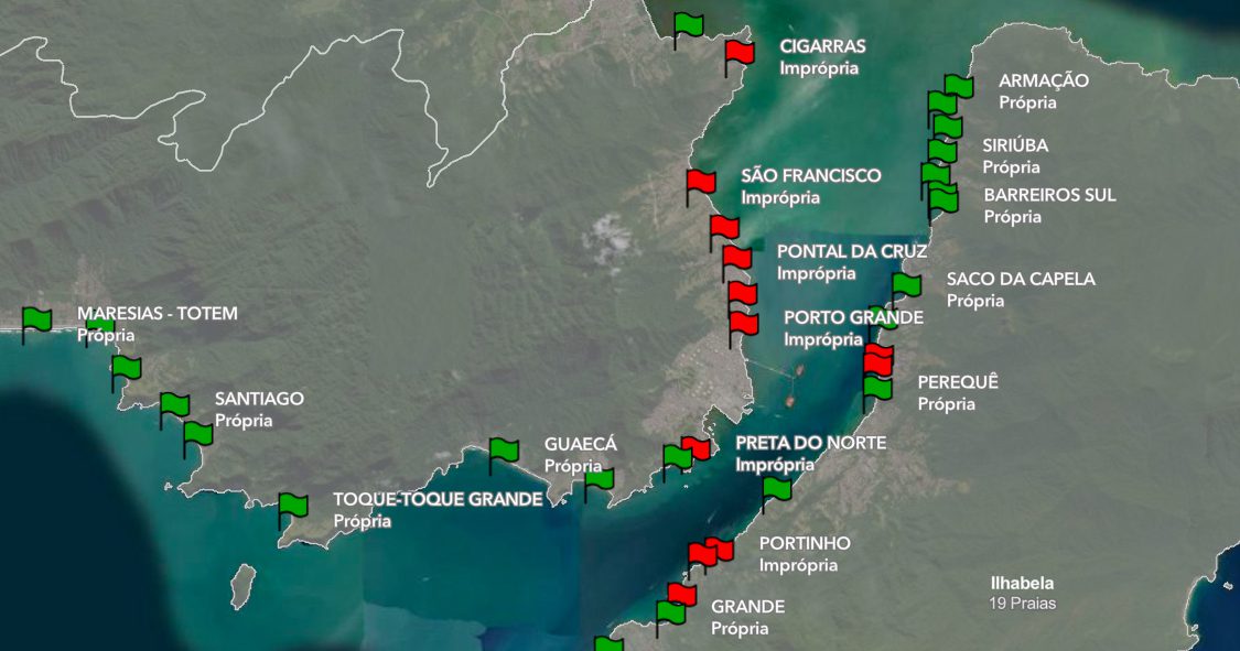 - Em São Sebastião estão impróprias as praias, Deserta, Porto Grande, Preta do Norte, Pontal da Cruz, Arrastão, São Francisco e Cigarras.
